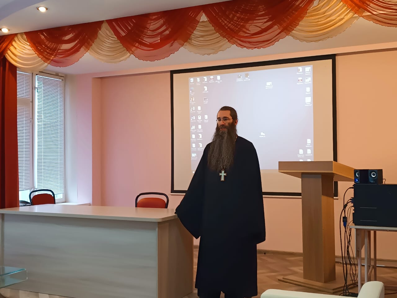 23 декабря в актовом зале Учебного корпуса № 4 Борского Губернского колледжа в п. Неклюдово прошла очередная просветительская встреча-беседа благочинного Борского округа иеромонаха Николая (Чеботарева) со студентами средних курсов. На занятии также присутствовали преподаватели и куратор по воспитательной работе колледжа.