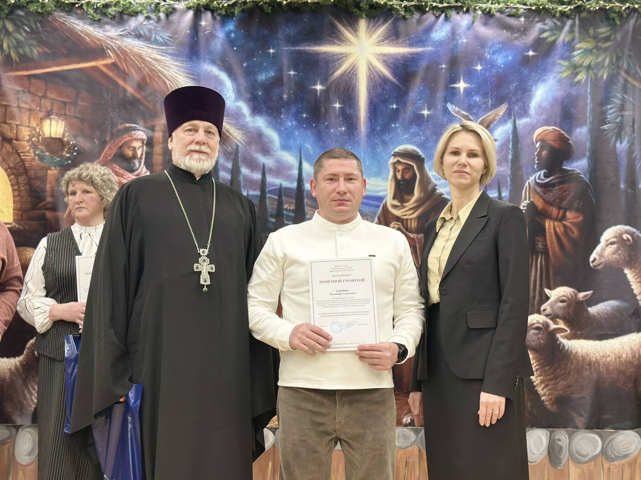 Почетными грамотами Министерства образования и науки Нижегородской области были отмечены учителя, проявившие особое усердие в обучении и воспитании подрастающего поколения. Среди награжденных педагоги Борского благочиния—Блинов Владимир Сергеевич учитель физической культуры и технологии православной гимназии во имя святого благоверного князя Димитрия Донского, Уткина Ирина Карповна заместитель заведующего православного детского сада во имя преподобного Сергия Радонежского. Поздравляем с заслуженной наградой!