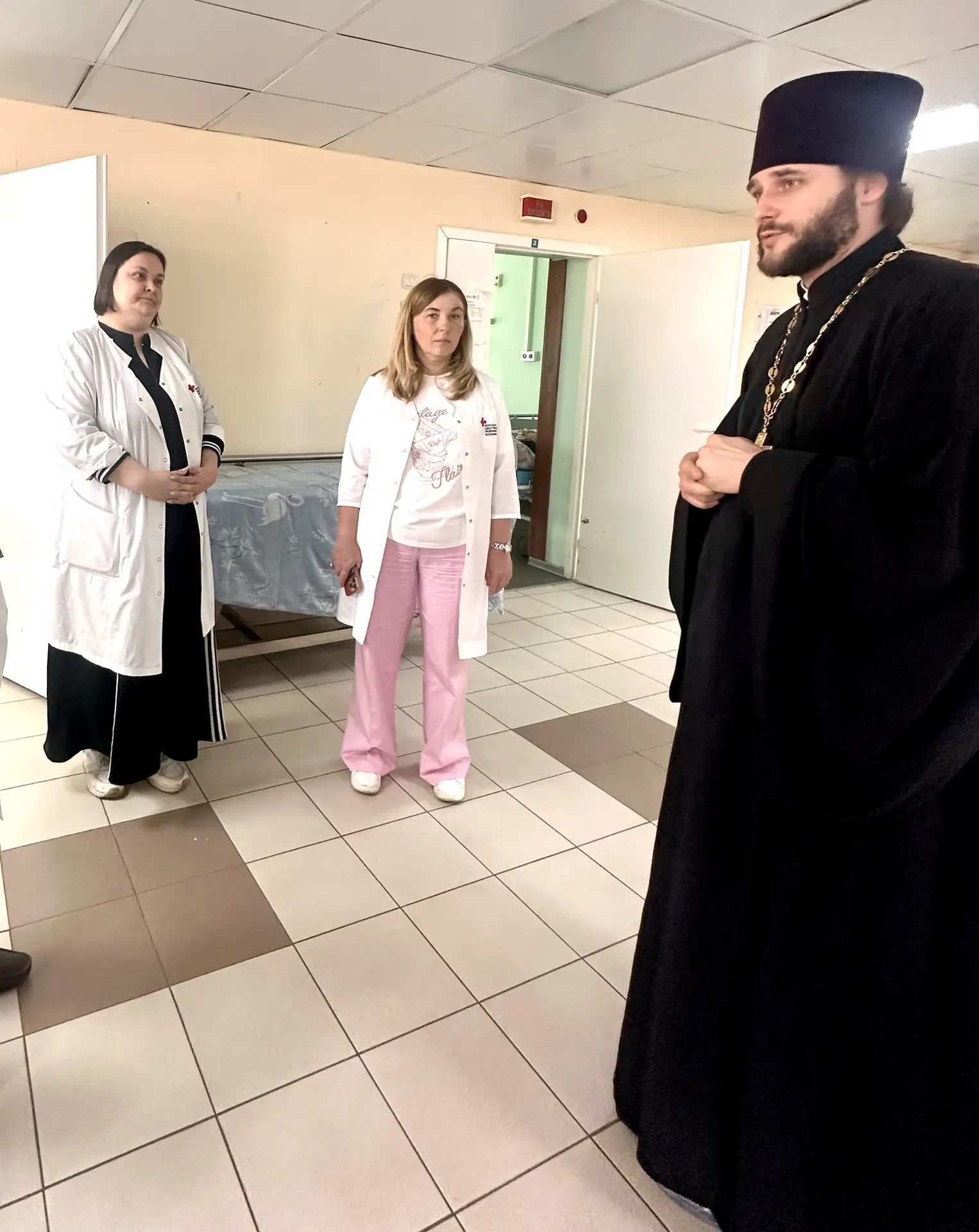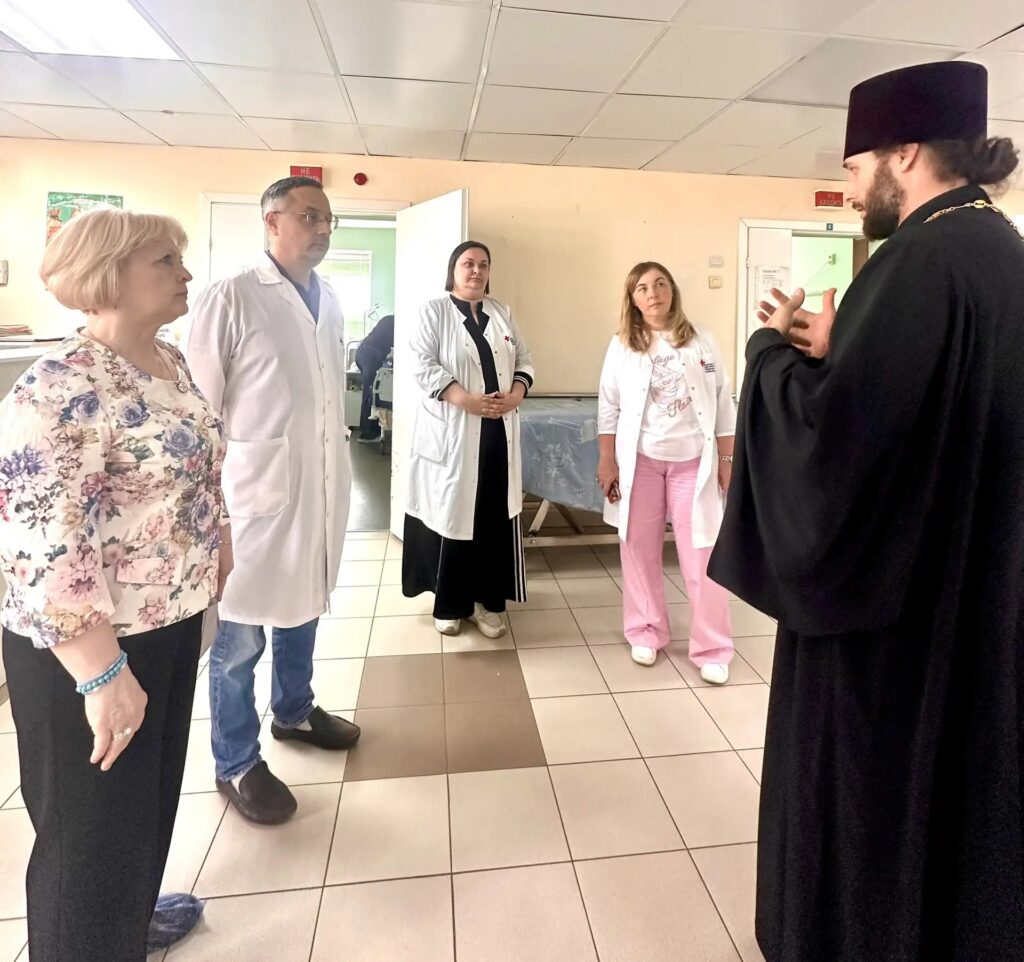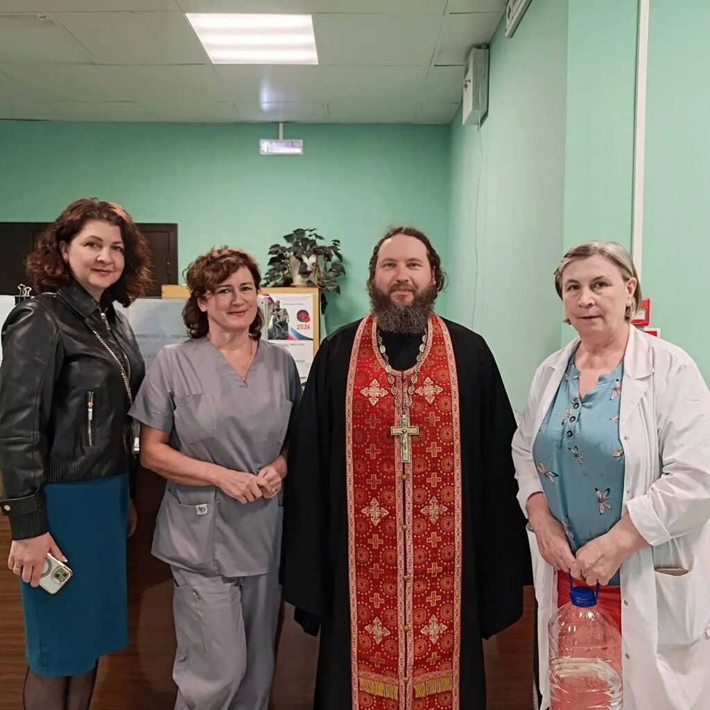 Вместе с благочинным в отделении присутствовали главный врач больницы Елена Гребёнкина, заместитель главного врача по медицинской части Александр Маков, заведующая отделением паллиативной медицинской помощи Наталья Селивёрстова, а также председатель профсоюзной организации работников образования Ирина Бекетова.