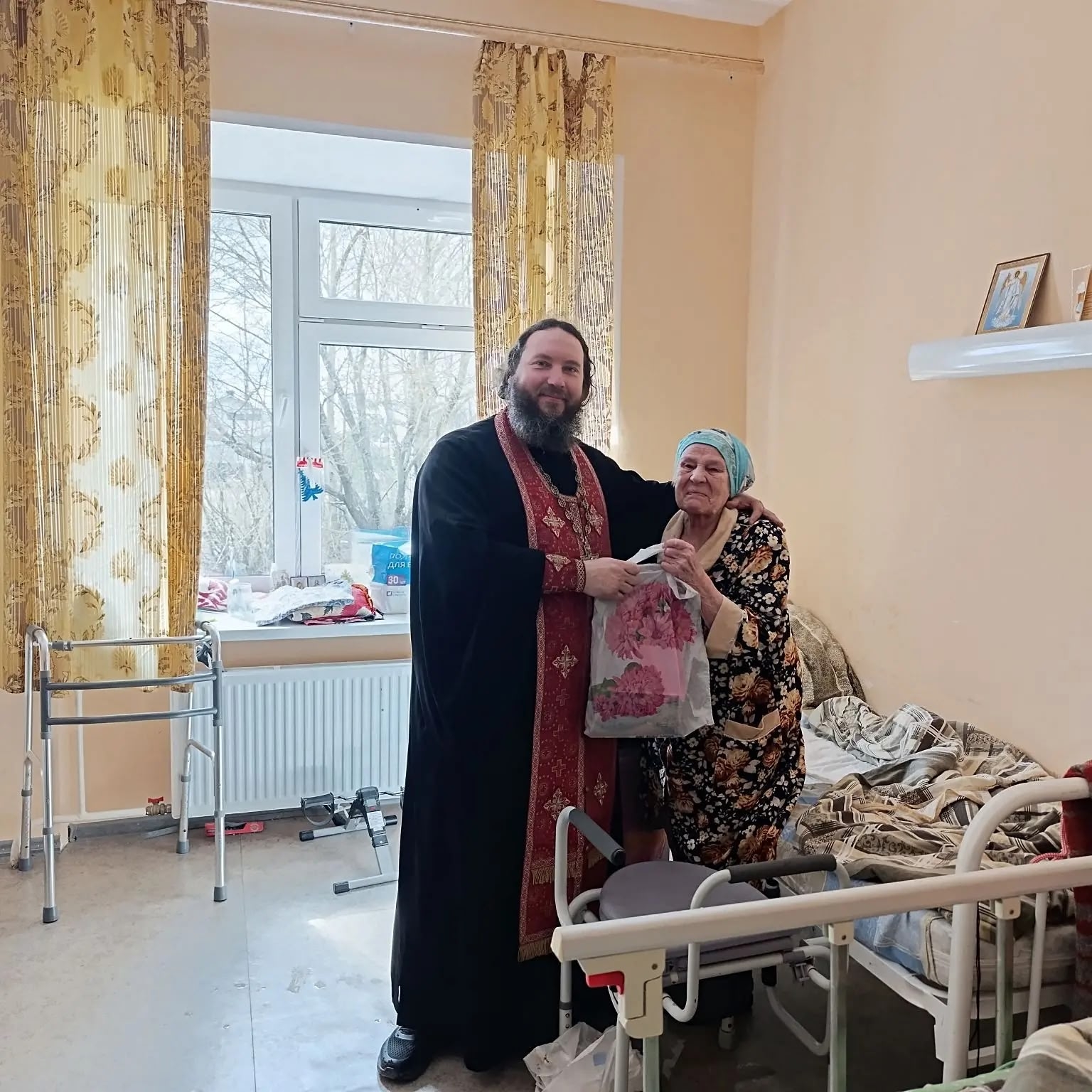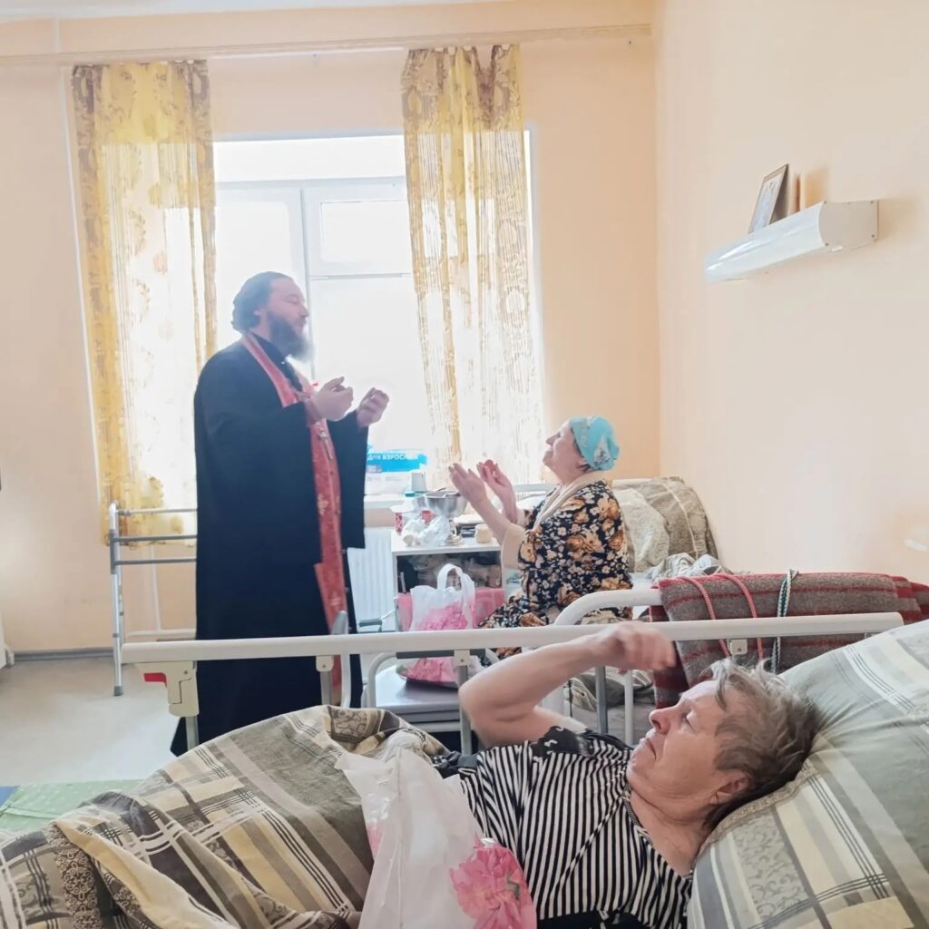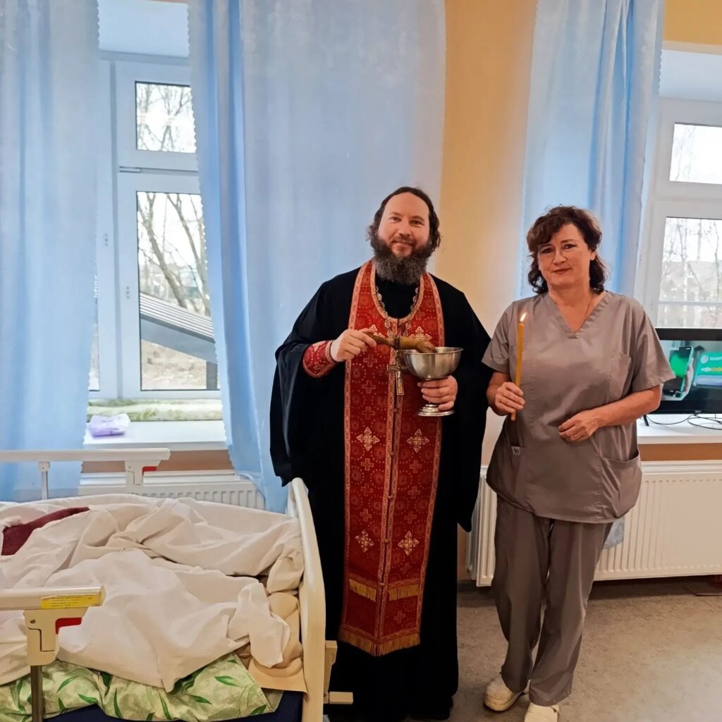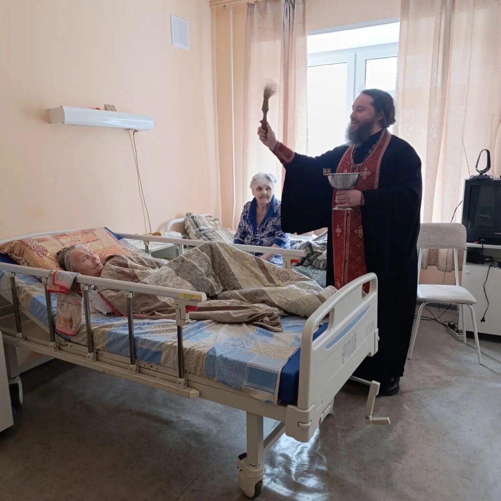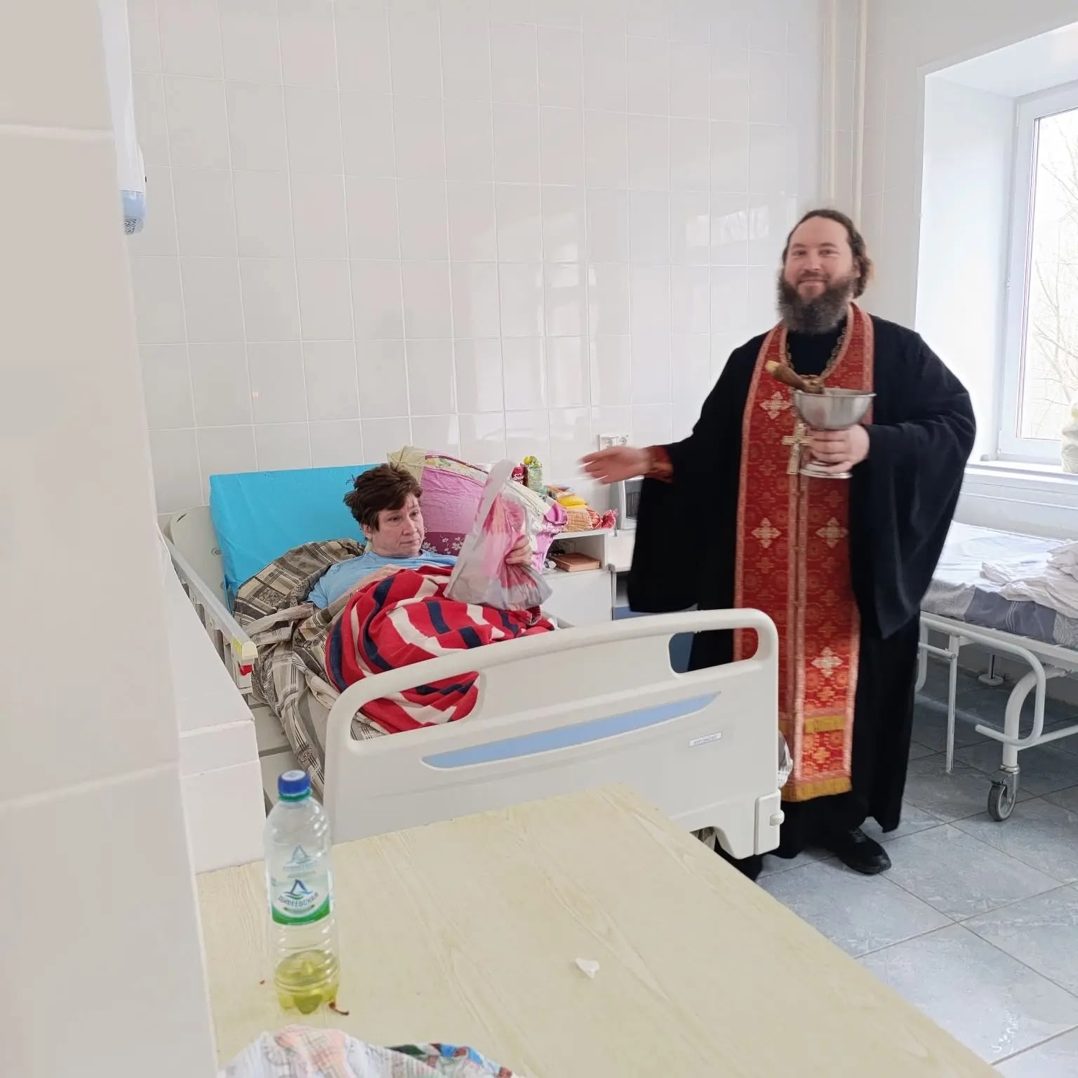 Иерей Александр Данилов посетил паллиативное отделение Линдовской больницы, поздравил пациентов и сотрудников и окропил всех святой водой.